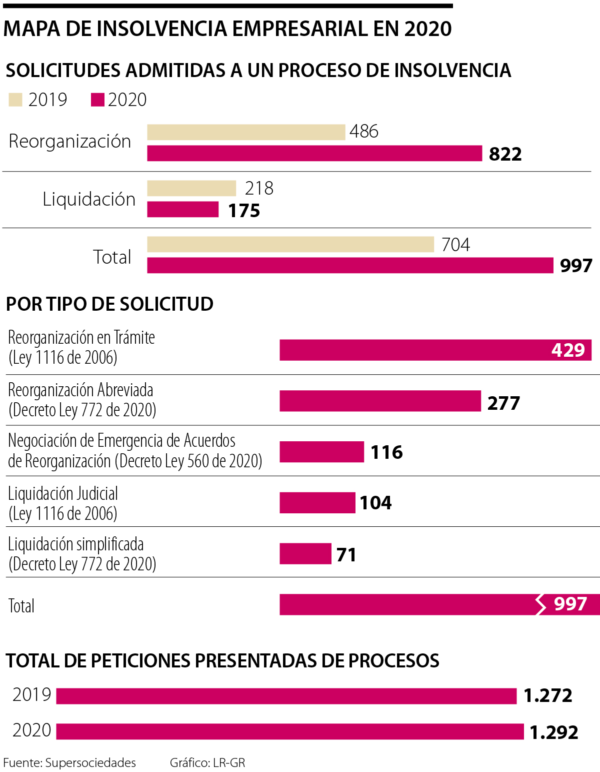 Solo en 2020 el ente de control admitió la solicitud de 822 empresas para ser reorganizadas, frente a las 486 de 2019. Mientras que a 175 se les aprobó el proceso de liquidación, frente a las 218 del año inmediatamente anterior.
