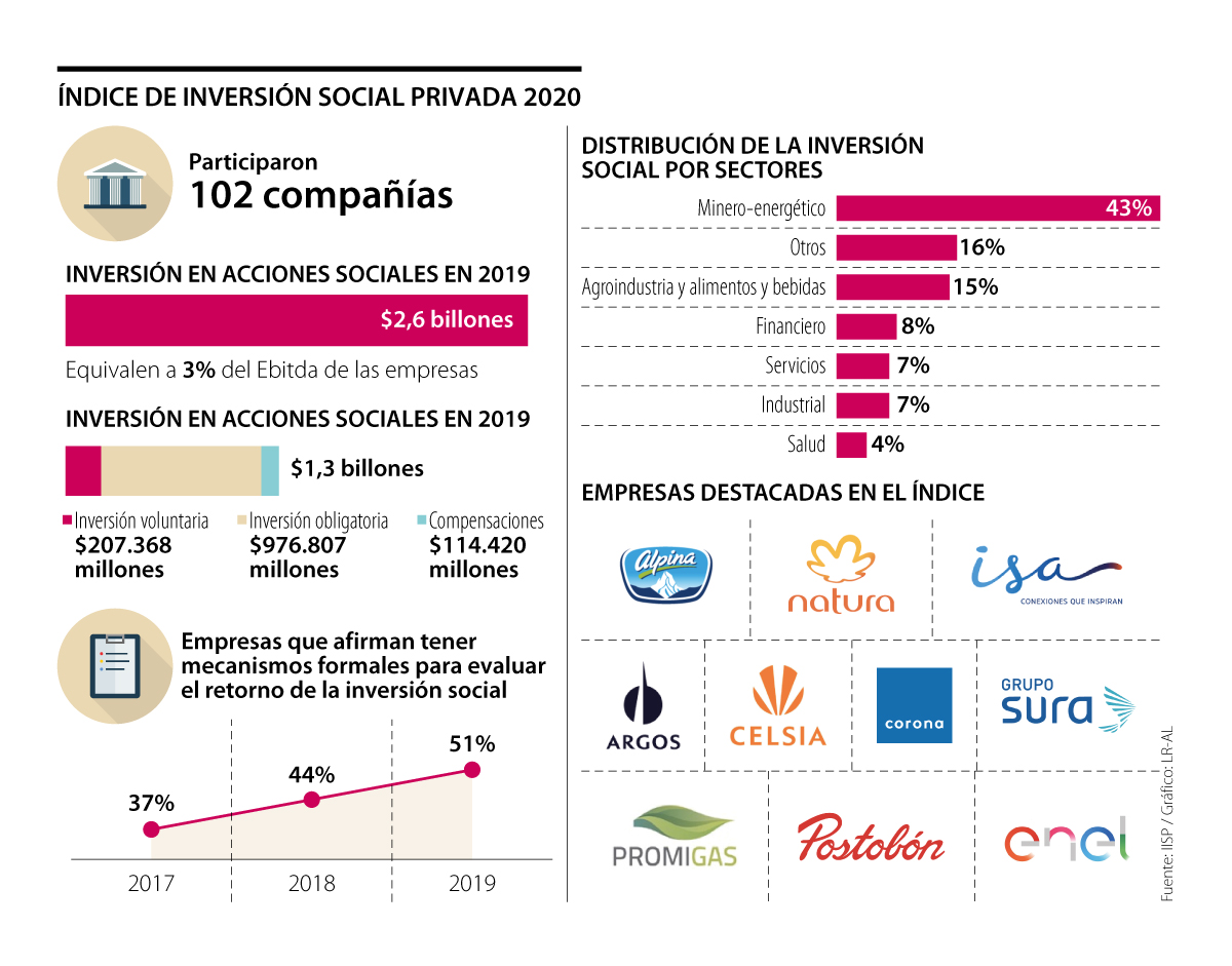 El Índice de Inversión Social Privada revela cómo estuvieron distribuidas las contribuciones de las empresas según su actividad económica. En 2019, 43% de la inversión en responsabilidad social vino de compañías del sector minero-energético. Siguen, en su orden, empresas de la agroindustria y alimentos y bebidas (15%); del sector financiero (8%); de los sectores industrial y de servicios, ambos con 7%; y de salud (4%). El restante 16% de las inversiones provino de compañías de otros sectores de la economía.
