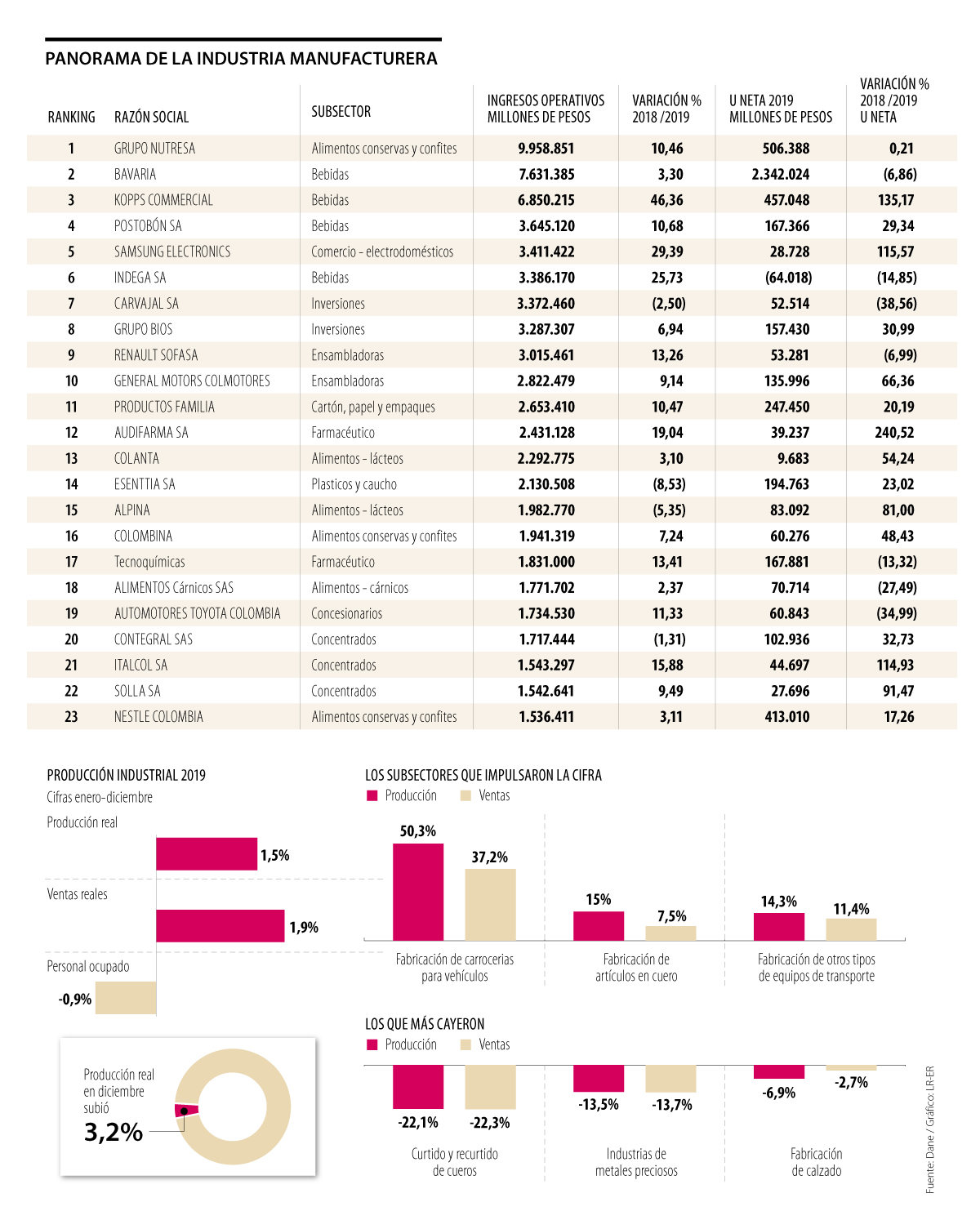 Estas cifras en verde también se hicieron evidentes en el informe de la Superintendencia de Sociedades con los ingresos de las empresas más grandes del país en 2019. Al segmentar las 100 empresas por sectores, el manufacturero totaliza más de $72,4 billones, y entidades como Grupo Nutresa, Bavaria, Koops Commercial, Postobón, Samsung Electronics y Renault Sofasa lideran dentro del listado de mayores ingresos al cierre del año pasado.