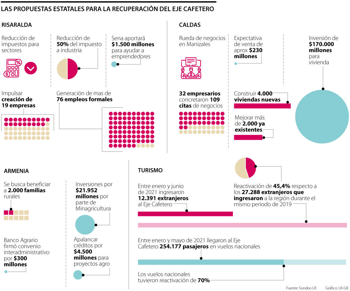 Alcaldías y gobernaciones del Eje Cafetero han trabajado de la mano para liderar la reactivación económica de la región, que representa 4% del PIB nacional. Asimismo, entidades nacionales y gremios han puesto de su parte, con el objetivo de impulsar la mayoría de los sectores y el músculo financiero de los departamentos de Caldas, Risaralda y Quindío.