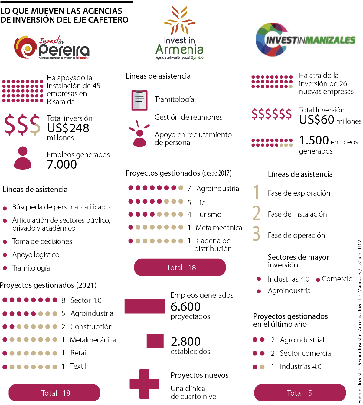 Con ese importante papel, en la región del Eje Cafetero existen tres agencias encargadas de atraer inversión a los diferentes departamentos que integran la zona: Invest in Armenia, Manizales y Pereira.
