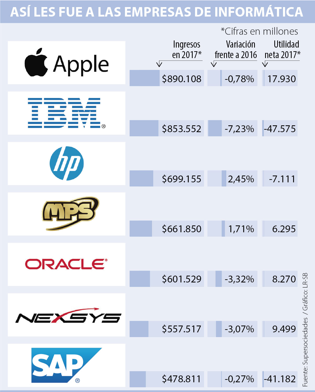 Apple, IBM y HP cerraron el año pasado como las compañías con los más altos ingresos del sector informático. De acuerdo con cifras de la Supersociedades, la primera de ellas fue Apple, al facturar $890.108 millones. Este gigante tecnológico quedó en la punta del listado, a pesar de que esta cifra fue 0,78% inferior a lo facturado en 2016.