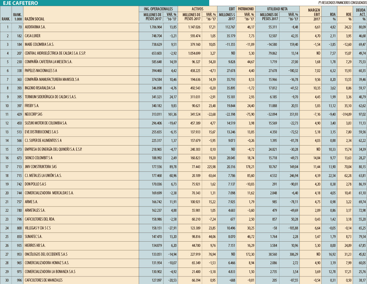 De acuerdo con información de la Superintendencia de Sociedades, las empresas Casa Luker, Mabe, la Central Hidroeléctrica de Caldas (Chec) y la compañía cafetera La Meseta, también mantuvieron sus posiciones en el escalafón frente a sus resultados de 2016, abarcando del segundo al quinto lugar de las compañías más importantes del triángulo del café en Colombia.