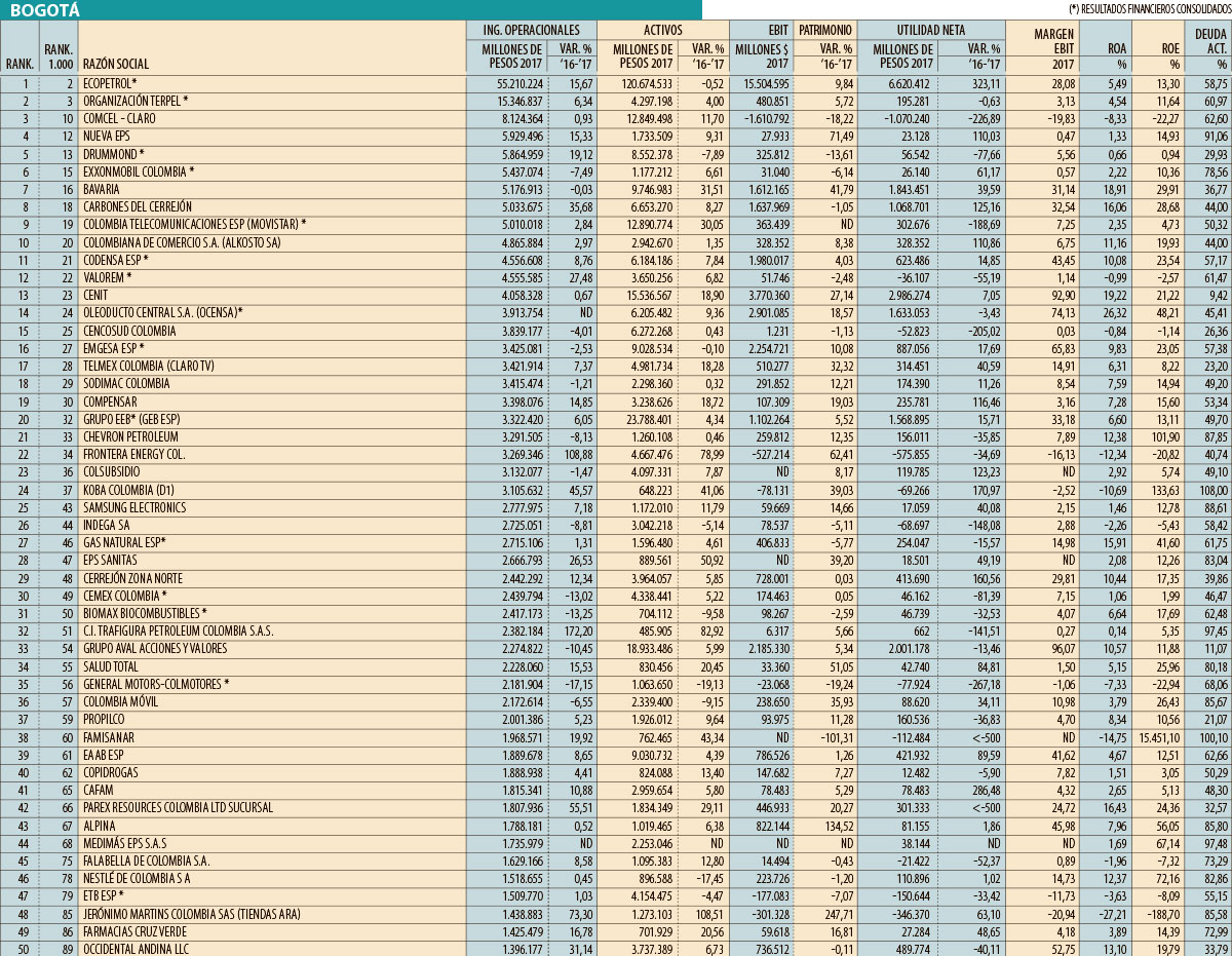 Se trata de la petrolera Ecopetrol, que con ingresos por $55,21 billones, no solo es la compañía más grande del país, sino de Bogotá; y de Terpel, que con ventas de $15,34 billones,