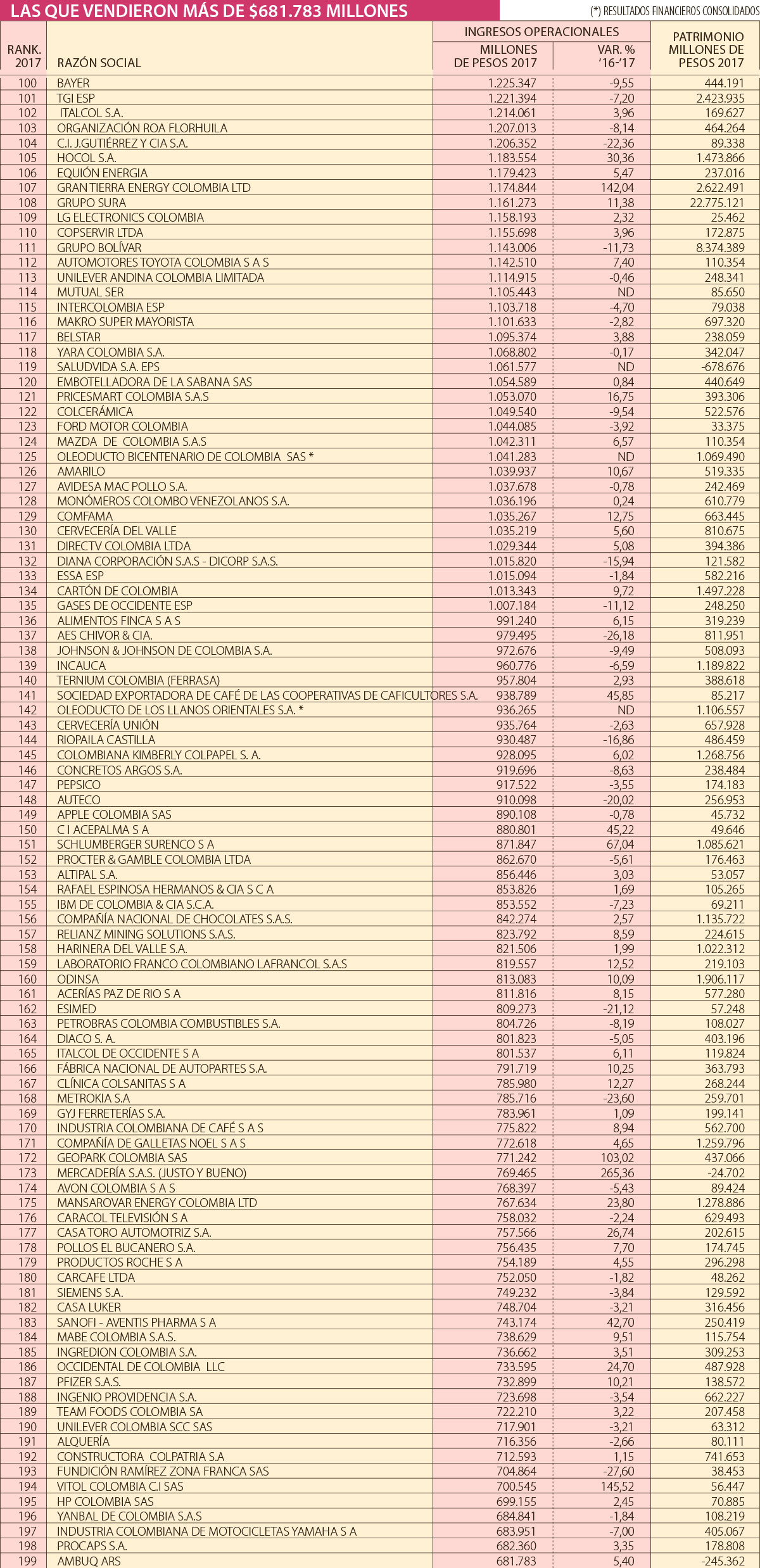 Bayer, TGI e Italcol son las empresas que lideran este segundo grupo de 100 empresas que más venden, específicamente de la 100 a la 199. Con ingresos operacionales el año pasado de $1,22 billones para los dos primeras y $1,21 para la tercera, las compañías quedaron por encima de empresas como Gran Tierra, Equión Energía, Unilever, Makro y Cartón de Colombia.