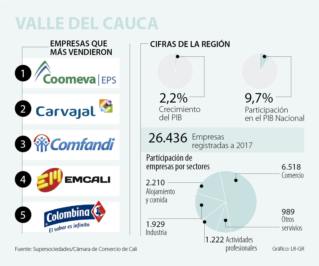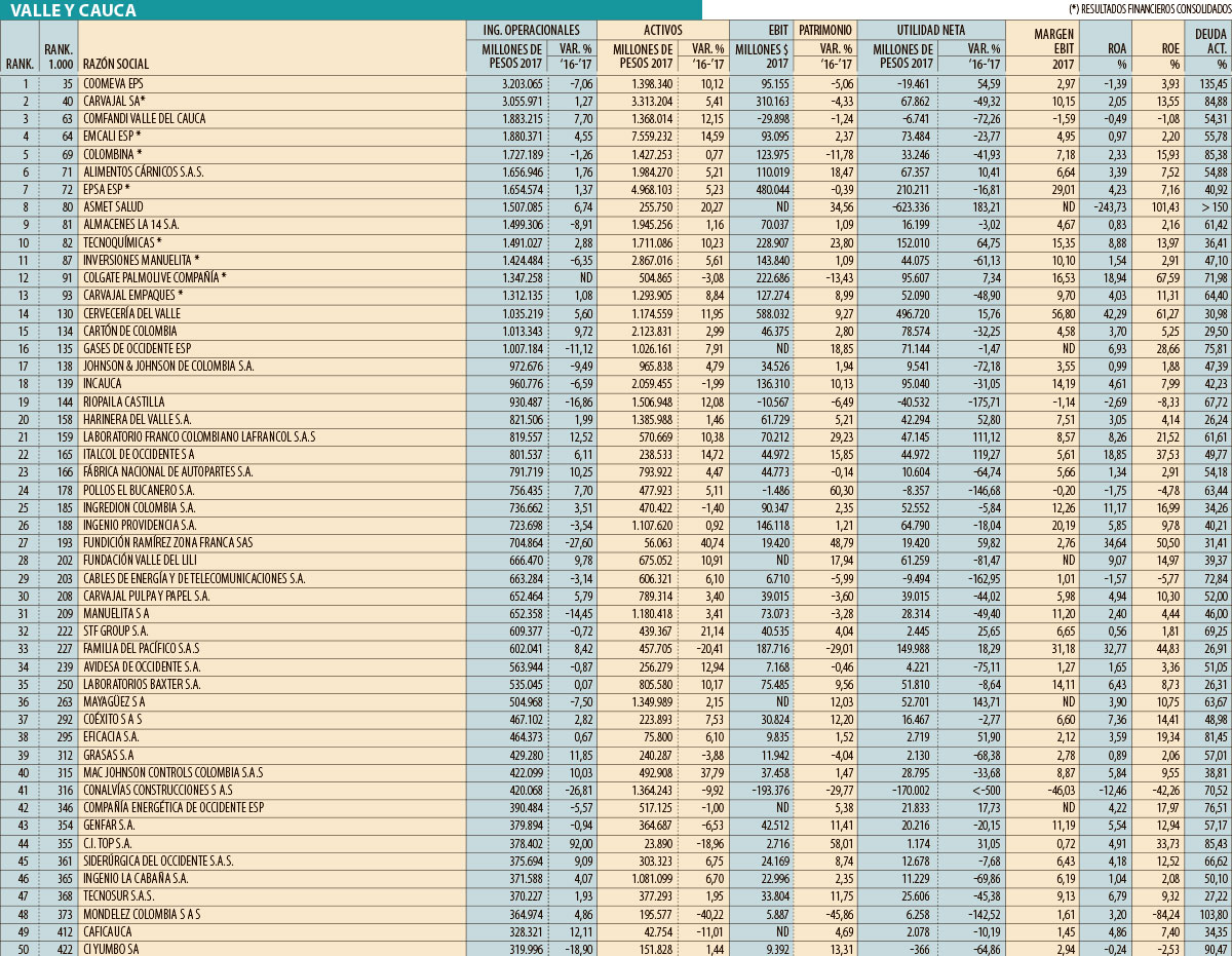 Las cinco compañías que más facturaron en 2017 son: Coomeva EPS, con $3,20 billones; Carvajal, con $3.05 billones; Comfandi Valle del Cauca, con $1,88 billones; Emcali ESP, con $1,88 billones; y Colombina, con $1,72 billones.