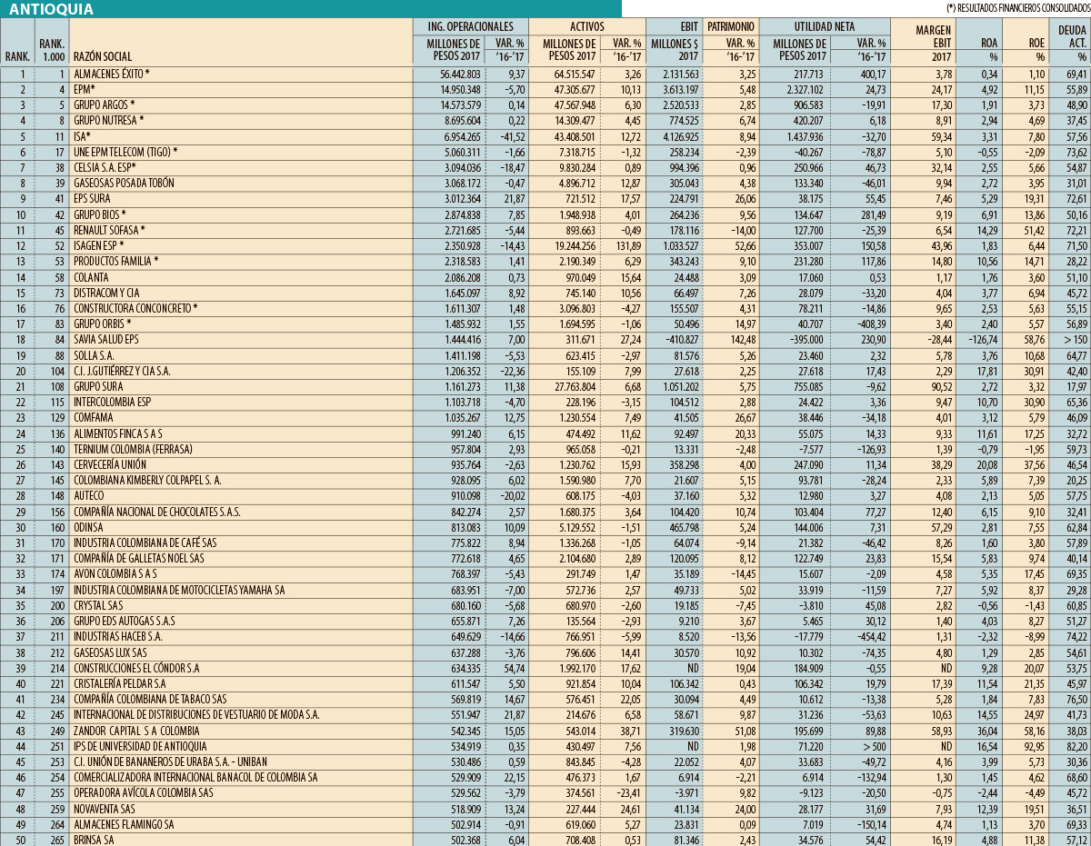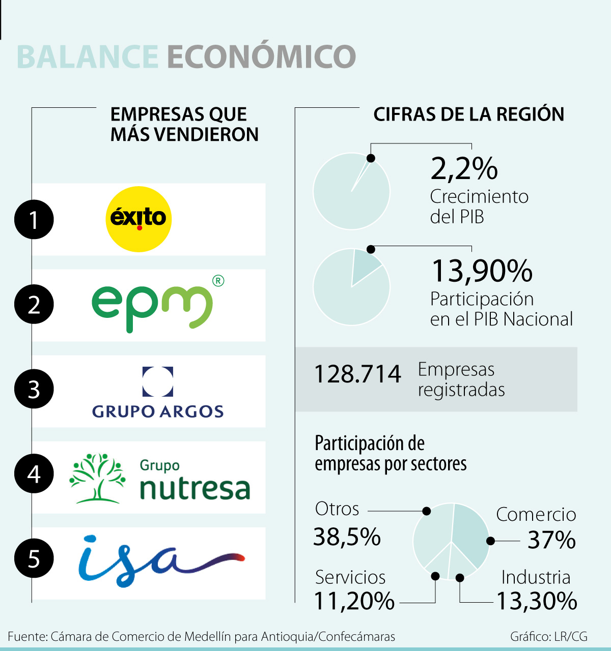Las tres empresas con mayores ingresos operacionales consolidados en la región fueron Almacenes Éxito, que registró ingresos en 2017 por $56,44 billones; EPM, que registró $14,95 billones; y Grupo Argos, que totalizó $14,57 billones.