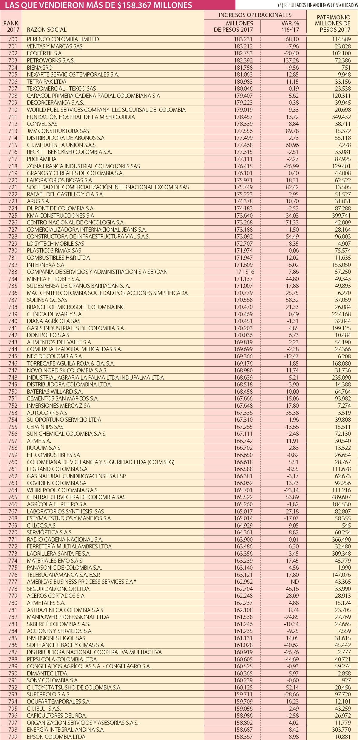 El séptimo grupo de compañías de este ranking contempla empresas que facturaron ingresos operacionales entre $158.367 millones (monto que registró Epson Colombia) y $183.231 millones, cifra que posicionó como la primera del grupo (en la casilla 700) a Perenco Colombia Limited, que aumentó sus ingresos en 68,10%.