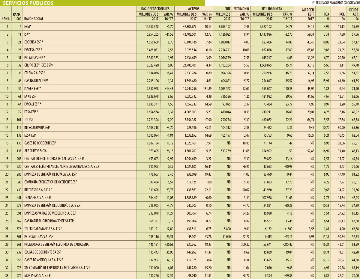 Al igual que en 2016, el principal jugador en los indicadores del sector fue el Grupo EPM, que facturó $14,95 billones en 2017, y continuó a la cabeza pese a su caída de 5,7% con relación a sus ingresos consolidados de 2016 de $15,8 billones. Sin embargo, la compañía consolidó al alza su utilidad neta que cerró el año en $2,32 billones gracias a la diversificación de su portafolio y a inversiones importantes, como el proyecto Hidroituango.