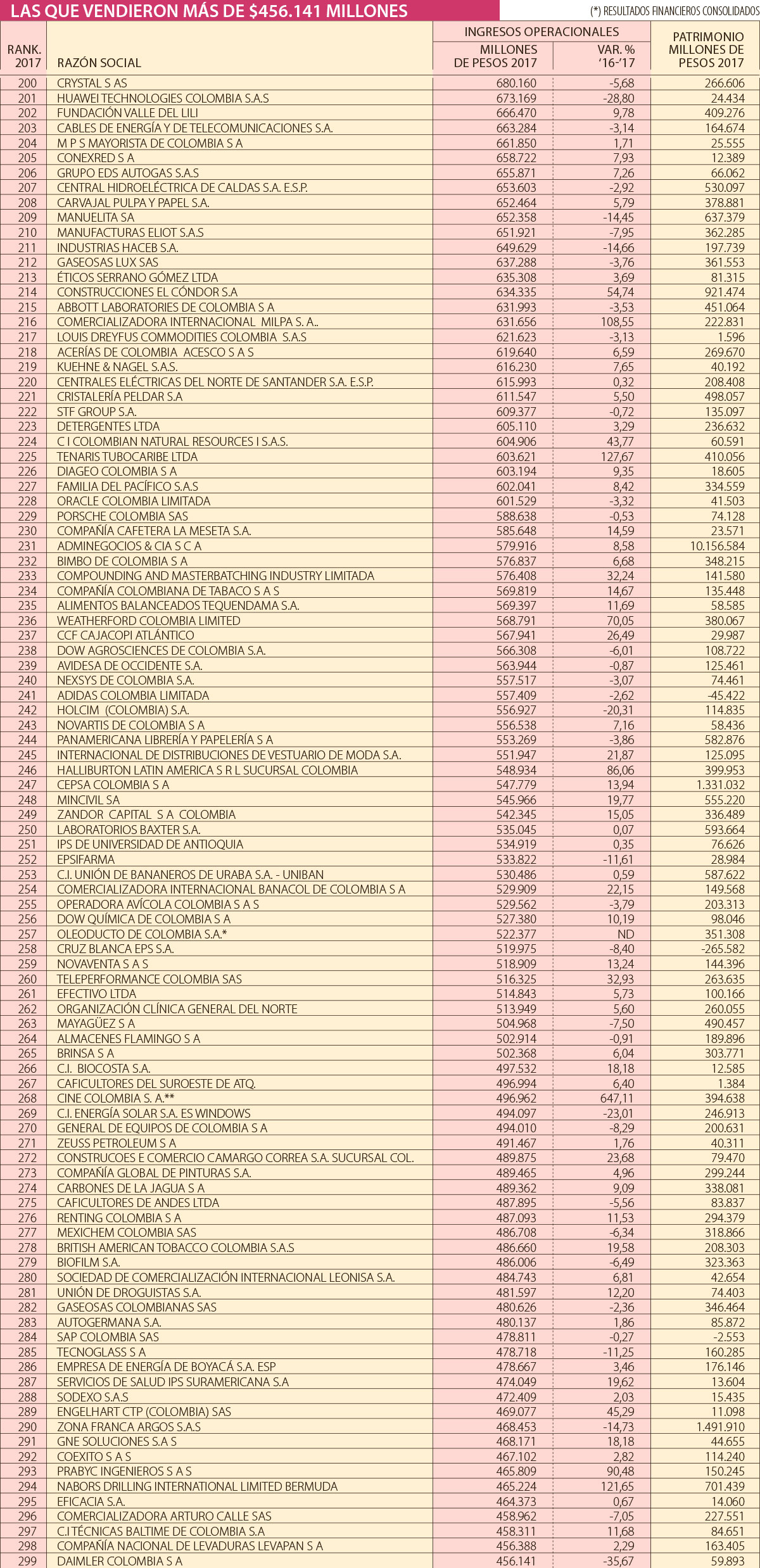 De acuerdo los datos de los reportes financieros consolidados, compilados por LR, la empresa líder en este tercer grupo de 100 empresas fue Crystal SAS (Punto Blanco, Gef, Baby Fresh), que el año pasado tuvo ingresos de $680.160 millones, aunque registró pérdidas por $3.810 millones para el mismo período. A esta compañía le siguió la empresa que opera en el sector de tecnología Huawei Technologies Colombia S.A.S., con ventas de $673.169 millones y una utilidad neta de $2.000 millones.