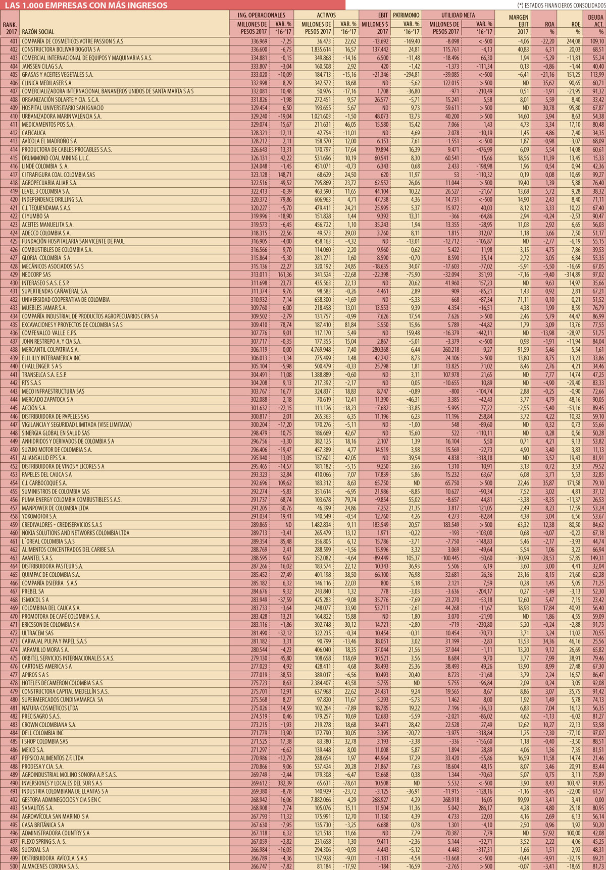 Entre algunas de las empresas más destacadas por utilidades: Adecco Colombia, que tuvo utilidades por $1.815 millones, es decir una variación positiva de 312%; Suzuki Motor de Colombia, que cerró 2016 con utilidades de $15.569 millones (-22,7%). La compañía que lideró este top el año pasado, Mercantil Colpatria, este año ocupó la posición 438, con ventas por $306.119 millones y utilidades por $260.218 millones.