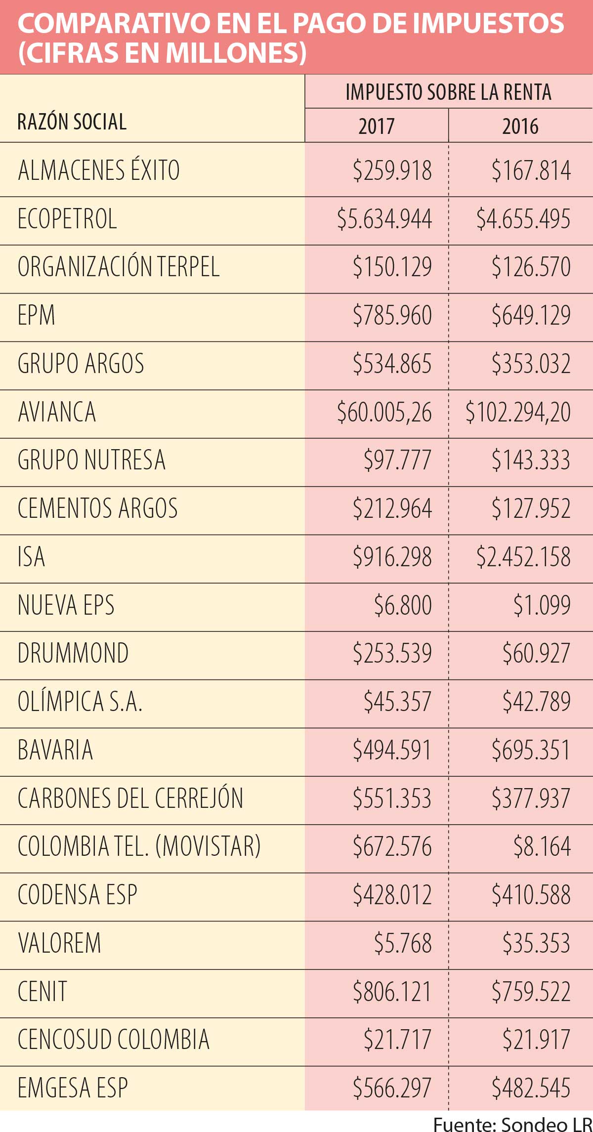 Del top 20 de empresas que aparecen en el ranking de las que más vendieron el año pasado, solo Reficar, Comcel-Claro, ExxonMobil Colombia, UNE EPM Telecomunicaciones (Tigo) y Compensar se abstuvieron de dar esa información. Con el resto de las firmas se hizo un trabajo comparativo para conocer casos como, por ejemplo, el de Ecopetrol, que tuvo ingresos por $55,2 billones y destinó el año pasado $5,6 billones en impuestos (sobre la renta).