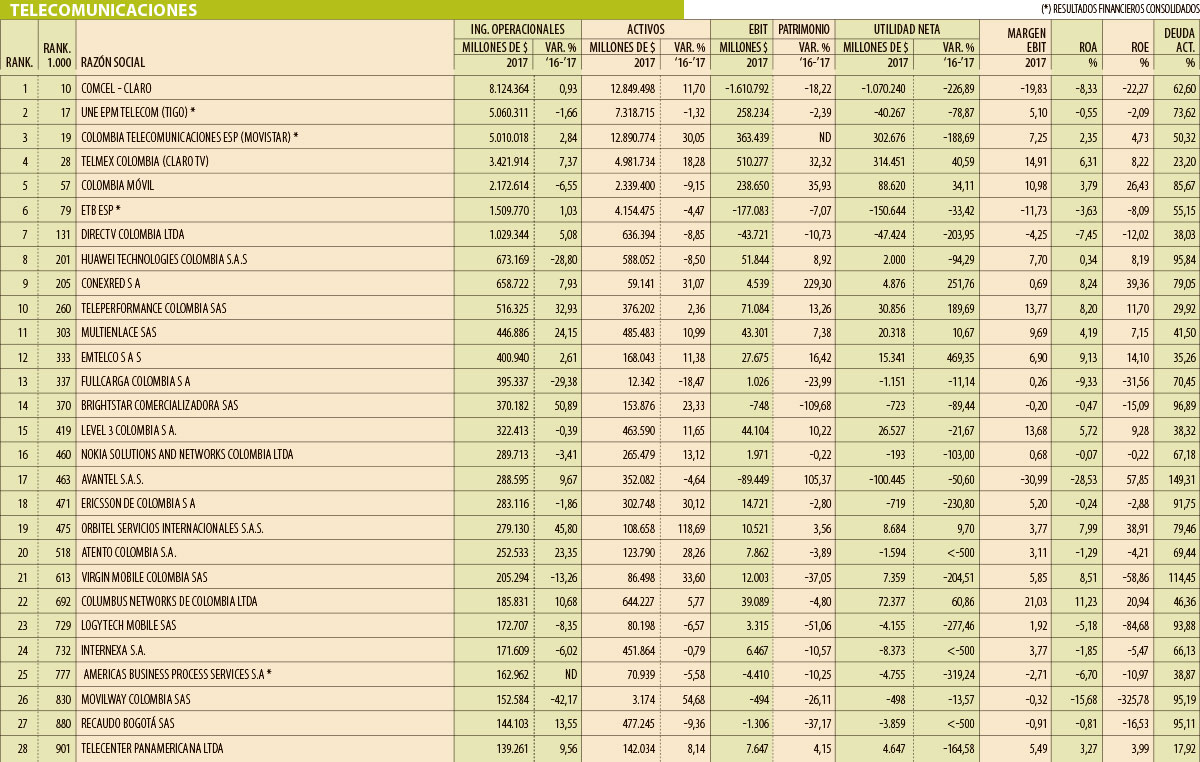 Quienes cerraron 2016 como los actores principales del sector, se mantuvieron en 2017. Claro, UNE EPM Telecomunicaciones (Tigo) y Movistar fueron los operadores del sector de telecomunicaciones que cerraron el año con mayor número de ingresos. Totalizando $8,12 billones, Comcel SA, razón social bajo la que se mueve la operación de telefonía móvil de Claro, fue la organización que registró los ingresos más altos.