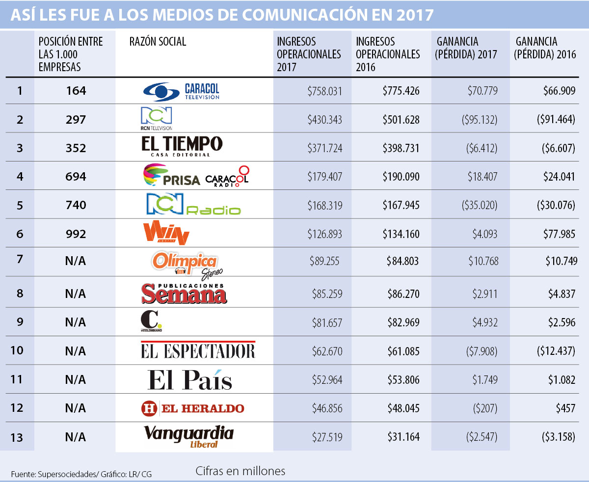 En las seis organizaciones de medios de comunicación presentes entre las 1.000 empresas de más ingresos, según la Supersociedades, solo RCN Radio vio un incremento en este aspecto frente a 2016: este fue de 0,22%. De la misma manera, El Espectador y Olímpica fueron otros de los pocos entre los medios de comunicación de relevancia que vieron ingresos más altos el año pasado frente a 2016. Las demás organizaciones destacadas presentaron variación negativa en dicha comparación.