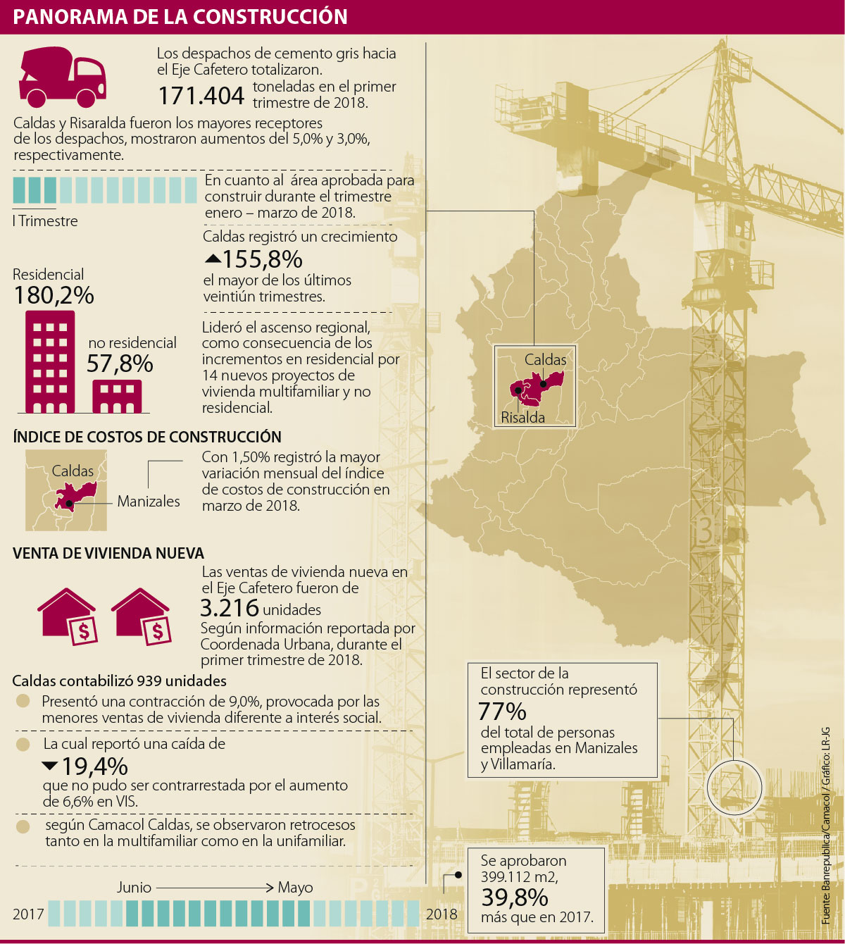El sector de la construcción ha tenido un desempeño positivo durante los primeros meses del año en el departamento de Caldas. De acuerdo con el boletín económico regional del I trimestre de 2018 emitido por el Banco de la República, el área aprobada para construir durante trimestre enero - marzo en el Eje Cafetero se ubicó en 480.345 m2, lo que significó un aumento de 38,2% al compararla con el mismo periodo de 2017, este comportamiento lo explicó el incremento de 51,6% en el área para vivienda, particularmente la diferente a interés social.