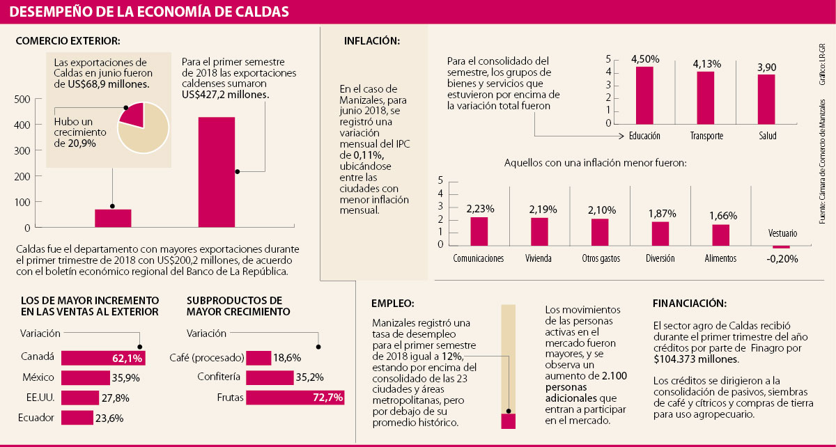 En lo que respecta al comercio exterior, Alejandro Barrera, coordinador de estudios económicos de la Cámara de Comercio de Manizales, asegura que las exportaciones de Caldas sumaron US$427,2 millones FOB para el primer semestre de 2018, registrando un crecimiento del 5%. “Estados Unidos, Canadá, Ecuador y México son los de mayor incremento en las ventas al exterior con variaciones de 27,8%, 62,1%, 23,6% y 35,9% respectivamente”, señaló Barrera.