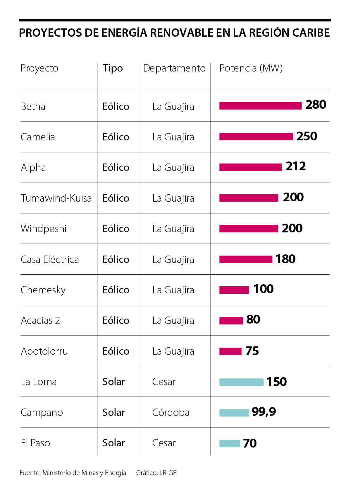 La Alta Guajira cuenta con las mejores condiciones de viento, por esto, según datos del Ministerio de Minas y Energía, en ese departamento están concentrados los nueve proyectos eólicos que actualmente hay en la región (ver gráfico).