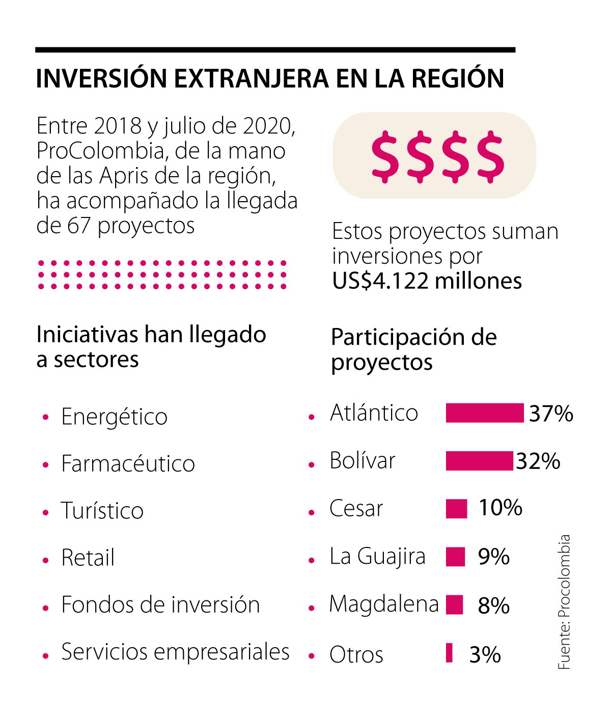 Entre 2018, 2019 y julio de 2020, ProColombia de la mano de las Apris de la región, ha acompañado la llegada de 67 proyectos extranjeros a la costa Caribe colombiana, con inversiones por US$4.122 millones.