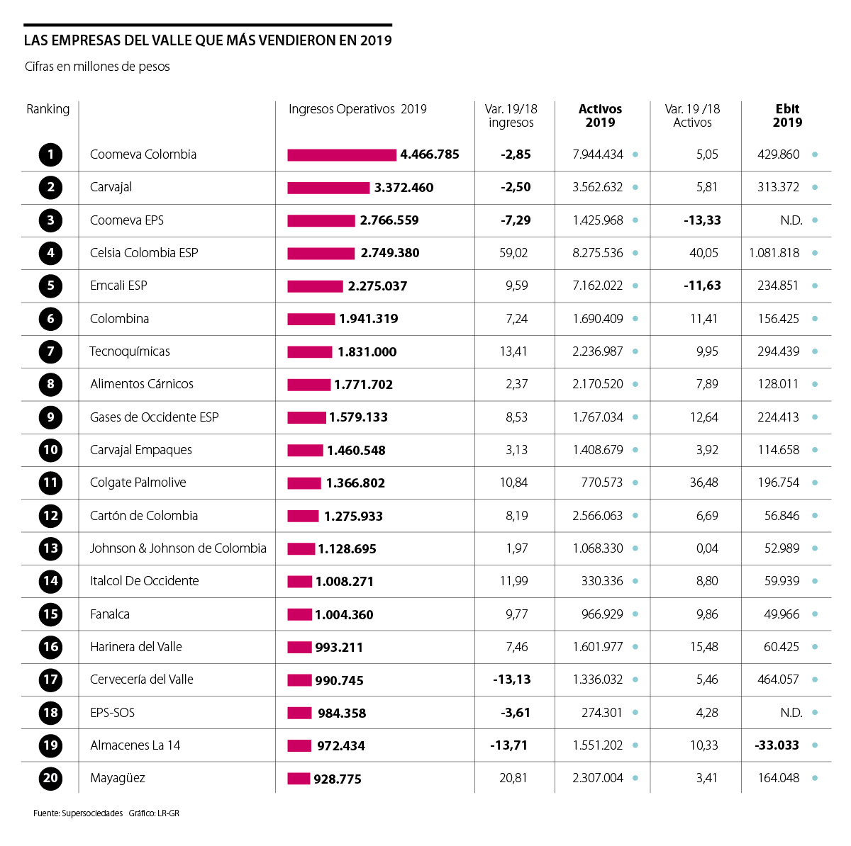 De acuerdo con el informe de la Superintendencia de Sociedades, las cinco compañías más grandes del Valle del Cauca sumaron ingresos operativos de $15,6 billones durante el año pasado. La lista de las empresas con mayores ingresos es liderada, al igual que en 2018, por Coomeva. La firma registró ventas por $4,46 billones en 2019 y, a pesar de la caída en este rubro (de 2,85%), logró mejorar en 28,59% su utilidad, llegando a $38.926 millones.