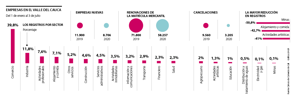 En cuanto a los sectores en los que más registros y renovaciones de empresas hubo en la región entre el 1 de enero al 3 de julio de 2020, la Cámara de Comercio de Cali contempla que el comercio se encuentra en primer lugar con 39,8% del total, seguido de la industria con 11,8% y las actividades profesionales, 7,6%.