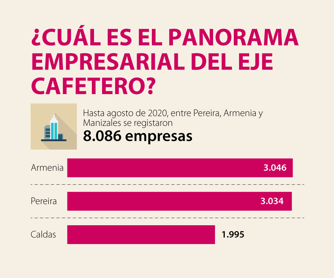 Según los datos entregados por las cámaras de comercio de Manizales, Pereira y Armenia, en lo que va de 2020 en el Eje Cafetero se han registrado un total de 8.086 empresas, siendo la capital de Quindío la que mayor cantidad reportó, con 3.046, seguida muy de cerca por la de Risaralda con 3.045 y por la de Caldas, con 1.995.