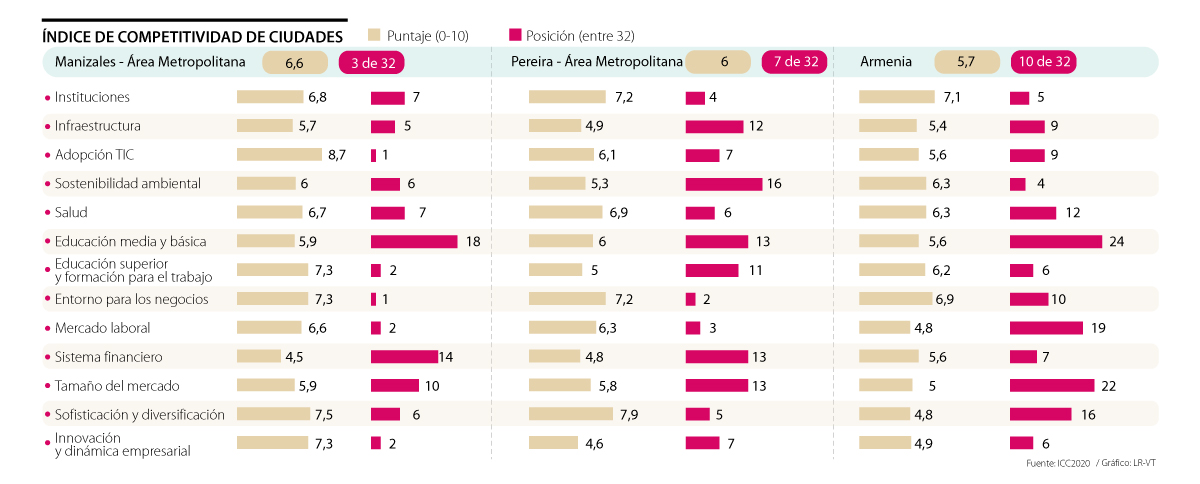 Justamente educación es uno de los puntos más débiles de las ciudades del Eje Cafetero; aunque mostraron un buen desempeño en educación superior, las tres capitales tienen grandes retos en los niveles de media y básica. En ese indicador Manizales quedó en la posición 18 de 32, Pereira en la 13 y Armenia ocupó el lugar 24. En el componente de instituciones, que mide desempeño administrativo, gestión fiscal, transparencia y seguridad y justicia, las tres capitales de la región quedaron en el top 10.
