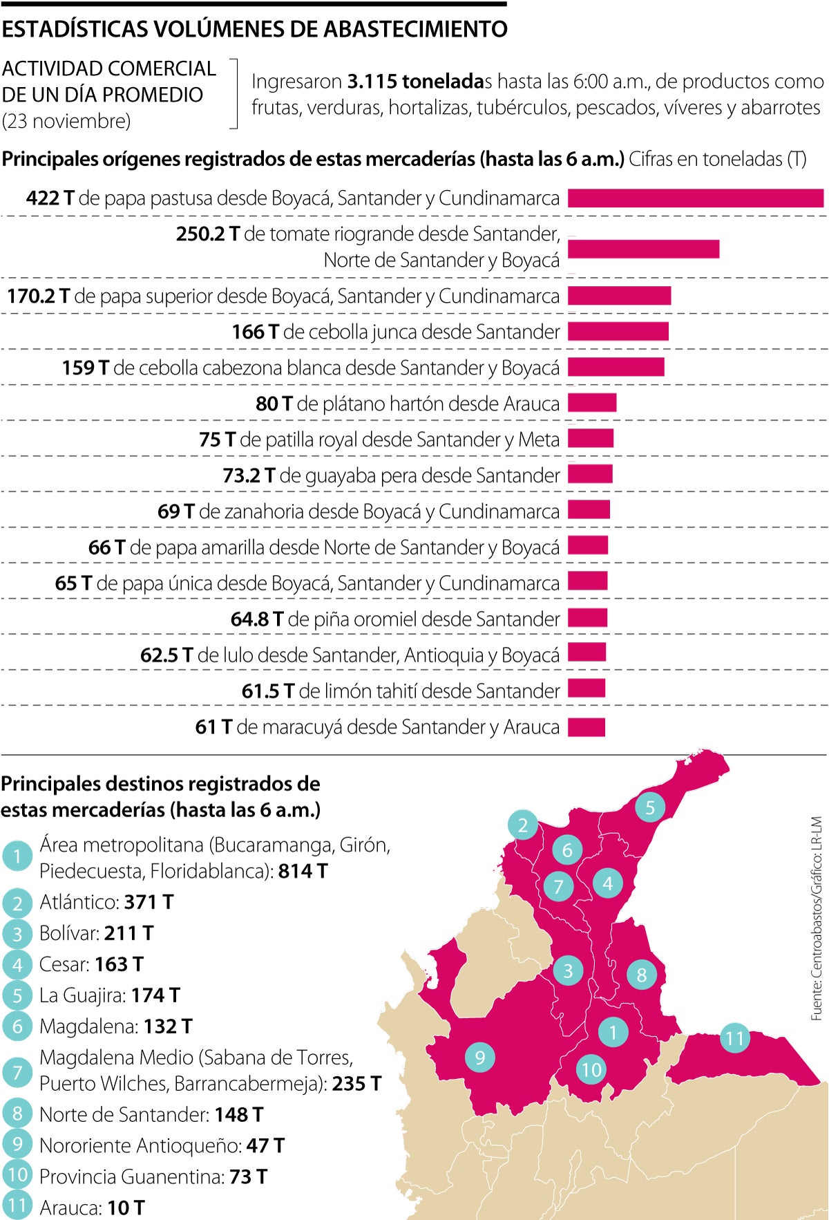Por esta central pasan a diario hasta 3.700 toneladas de producto (en especial los martes, jueves y sábados, que son los días de mercado), que son movilizadas por hasta 4.000 vehículos de carga y particulares. De estas, 35% abastece el consumo interno en Santander y 65% restante a departamentos como Atlántico, Bolívar, Cesar, La Guajira, Magdalena, Norte de Santander, Antioquia y Arauca.