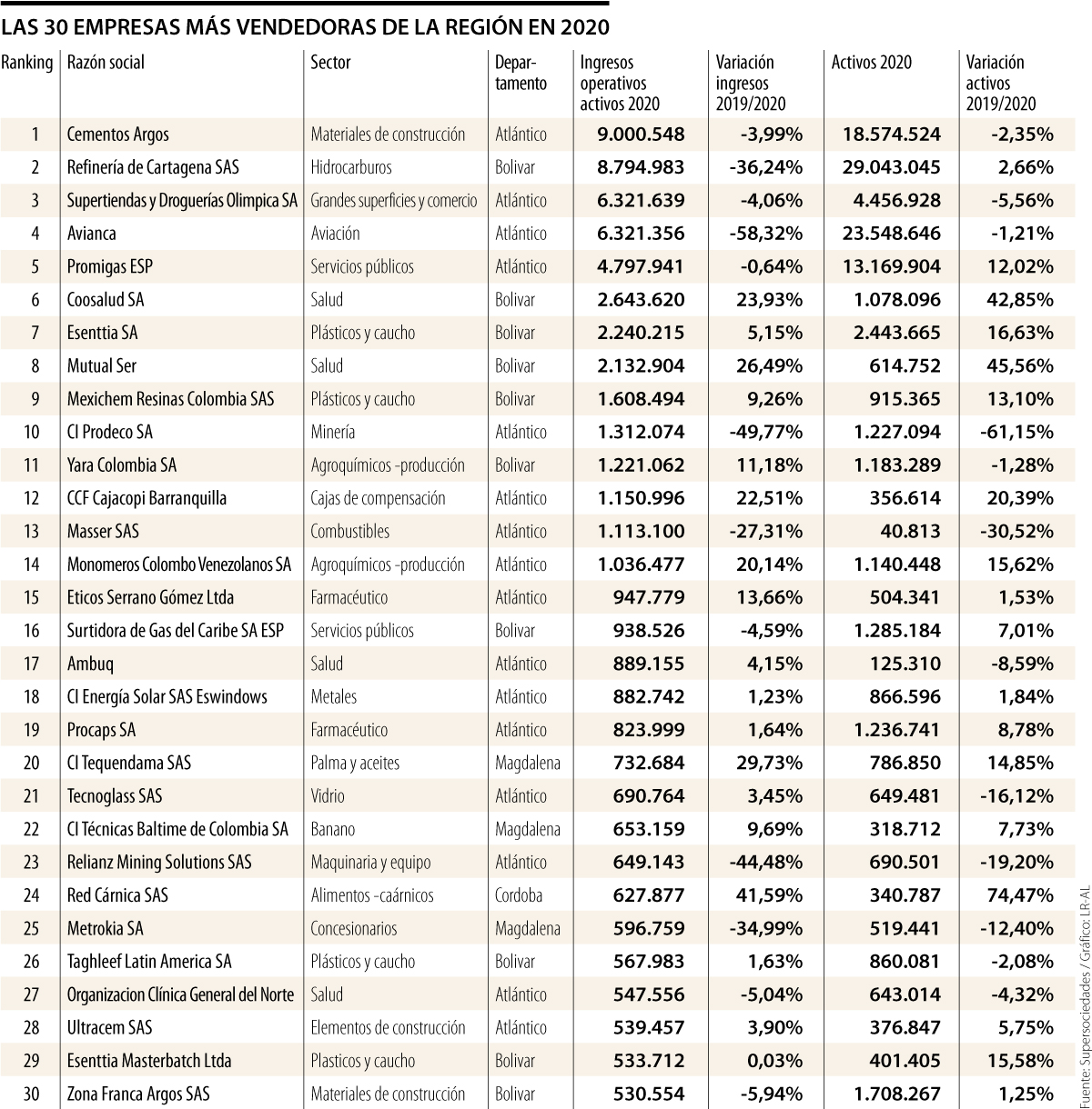 Las variaciones empiezan con que en 2020, la líder del ranking fue Cementos Argos con $9 billones de ingresos operacionales, lo que es 3,99% menos que los arrojados en 2019 cuando fueron $9,3 billones los ingresos. La compañía de cementos, la cual ocupó el puesto 10 a nivel nacional, registró también activos por $18,5 billones y $78.188 de utilidades netas (+35,85%).