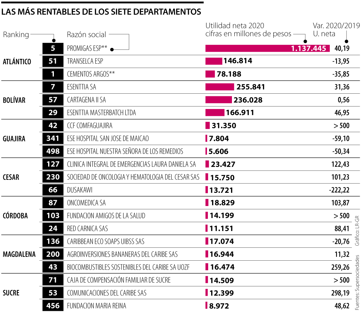 En Guajira está la caja de compensación Comfaguajira con $31.350 millones en utilidades, le sigue el Hospital San José de Maicao con $7.804 millones y termina de tercera el Hospital Nuestra Señora de los Remedio con $5.606. En Cesar está la Clínica integral de Emergencias Laura Daniela que dejó utilidades netas anuales por $23.427 millones, la Sociedad Oncológica y Hematológica con $15.750 millones y Dusakawi que, pese a que bajó sus ingresos en 2020, registró la tercera utilidad más grande del departamento con $13.721 millones.