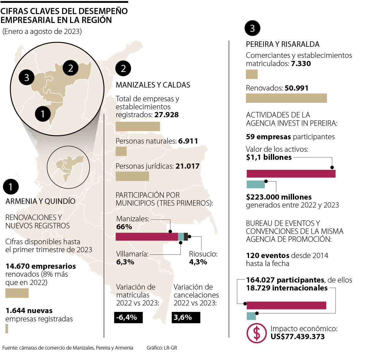 Lina María Ramírez, presidenta de la Cámara de Comercio de Manizales por Caldas, comentó que el inventario empresarial en el departamento llegó en agosto a 27.928 empresas registradas y renovadas, un 6,4 % menos que en el mismo periodo de 2022. El principal motivo fue el aumento de las cancelaciones, que se sitúa en el 3,6 % en el acumulado del año, con un pico de 1.111 novedades de este tipo en abril.