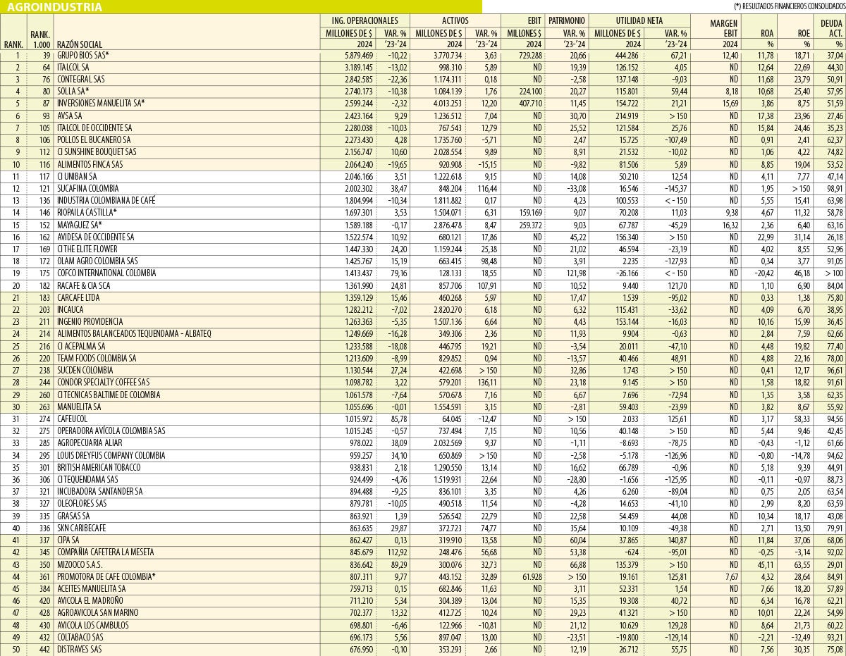 De este ranking, Grupo Bios se llevó el lugar de la más vendedora y quedó en el puesto 39 de las Mil Más Grandes. La compañía agroindustrial reportó $5,88 billones en ingresos operacionales durante 2024, aunque disminuyó esos ingresos en comparación a 2023, en donde tuvo $6,5 billones. Las ganancias cerraron en $444.286 millones, frente a $265.703 millones que consiguió en 2023.