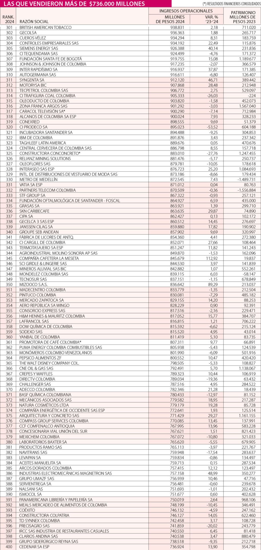 Le siguieron Gecolsa, quien había ocupado el primer lugar en 2023 dentro de este grupo, con $936.363 millones; Cueros Vélez, con $934.294 millones; Controles Empresariales SAS, con $934.192 millones; Siemens Energy SAS, con $926.388 millones; CI Tequendama SAS, con $924.499 millones; Fundación Santa Fe de Bogotá, con $919.755 millones; Johnson & Johnson de Colombia, con $917.235 millones; Inter Rapidisimo SA, con $916.937 millones; y Autogermana SAS, con $916,611 millones, cerrando el top 10 entre la 301 y 400.