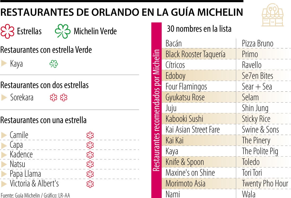 Visit Orlando resalta cómo el reconocimiento de la Guía Michelin a varios restaurantes de la ciudad puso a la ciudad en el radar de los foodies. En la edición 2025, la ciudad logró una cocina con dos estrellas (Sorekara), y seis más con una estrella (Capa, Camile, Kadence, Natsu, Papa Llama y Victoria & Albert’s), además de Kata con una estrella Verde. Igualmente en la clasificación Florida’s 2025 Recommended restaurants hubo 30 establecimientos.