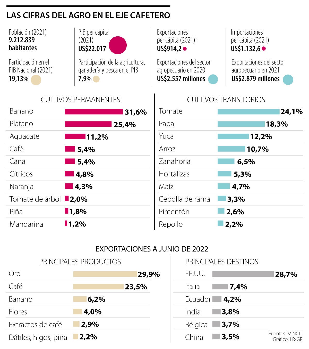 Aunque el café sigue siendo el producto insignia y el que acapara la mayor parte de la producción para exportación en los tres departamentos que componen el Eje Cafetero, el agro en esta región registra un crecimiento significativo jalonado, en parte, por otras producciones que se van abriendo paso tanto en los mercados nacionales como fuera del país. Según el MinCIT, la participación del Eje en el PIB nacional en 2021 fue de 19,13%, con exportaciones per cápita de US$914,2 e importaciones per cápita de US$1.132. El PIB per cápita de la región fue de US$22.017.