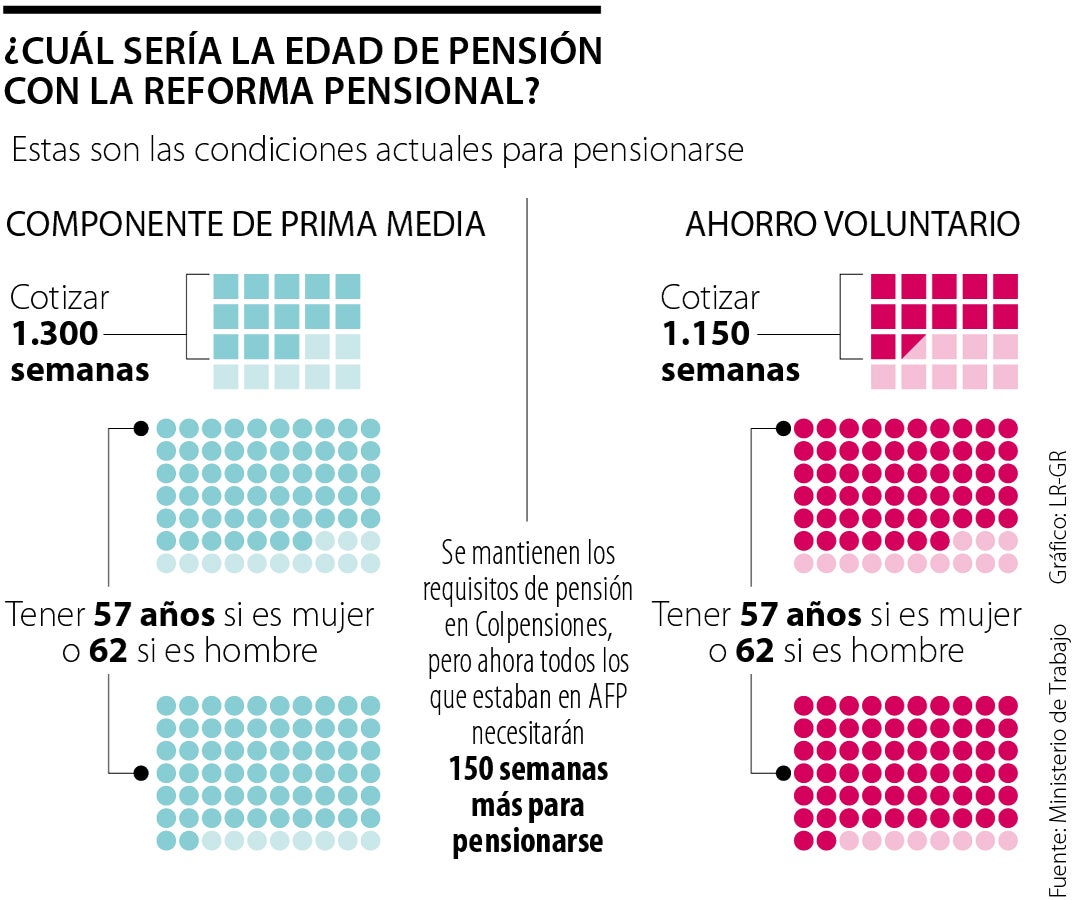 Es decir, nada cambiaría, excepto para aquellos que tengan menos de 1.000 semanas cotizadas y que en este momento estén dentro del régimen de ahorro individual, pues a ellos los cobijaría el régimen de transición. El cambio viene para aquellos que tengan menos de 1.000 semanas cotizadas, pues al ser Colpensiones el que definiría la causación, ya no se pensionarían con 1.150 semanas, sino con 1.300, tal como se establece en el régimen de prima media.