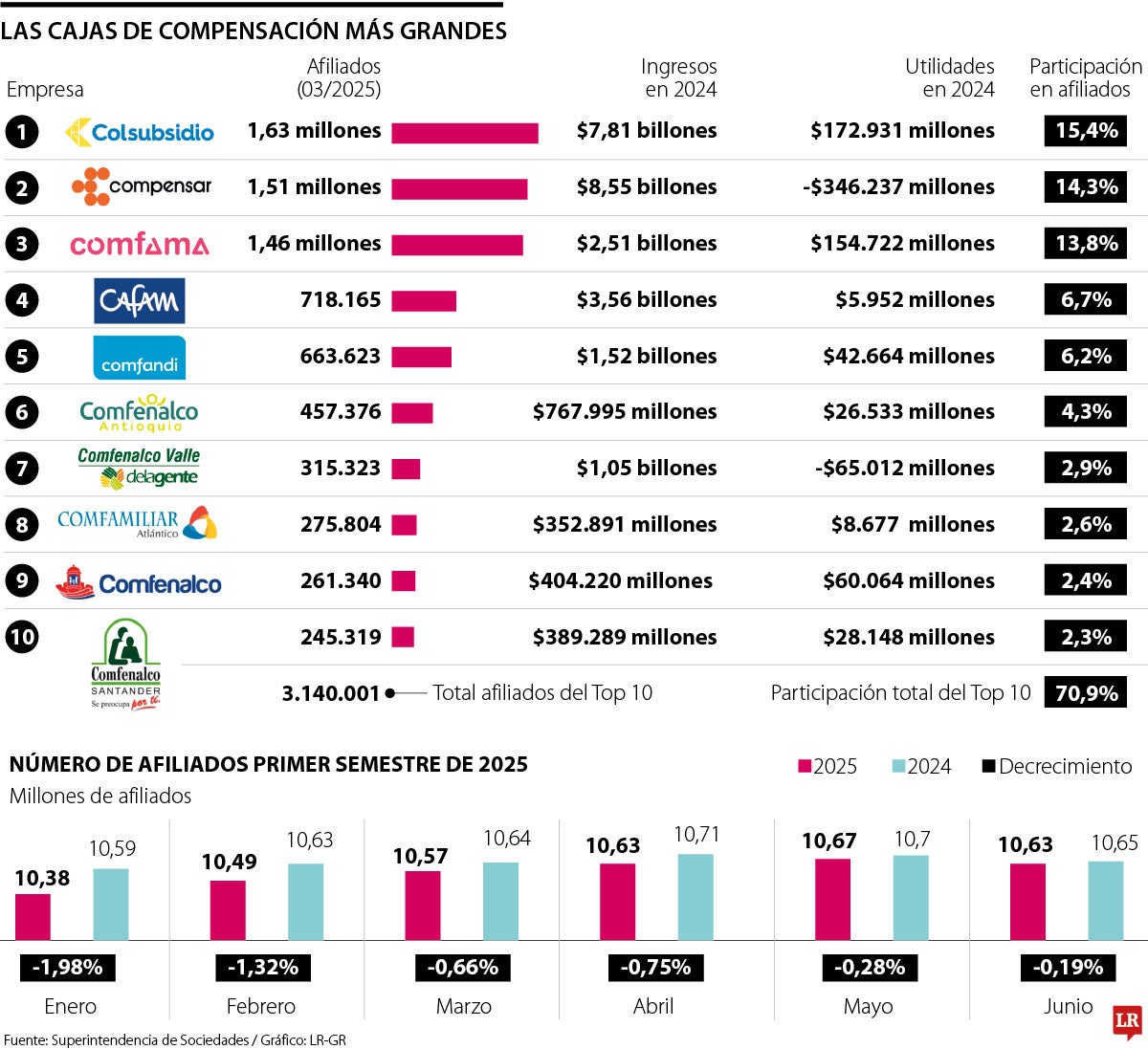 Con corte al primer trimestre de 2025, en ellas habían afiliados 10,57 millones de trabajadores, entre empleados e independientes, y 7,5 millones de ellos se encontraban afiliados a las 10 cajas de compensación más grandes del país: Colsubsidio, Compensar, Comfama, Cafam, Comfandi, Comfenalco Antioquia, Comfenalco Valle, Comfamiliar del Atlántico, Comfenalco Cartagena y Comfenalco Santander, con una participación de 70,9% sobre el total nacional. En junio, los afiliados ya sumaban 10,63 millones.