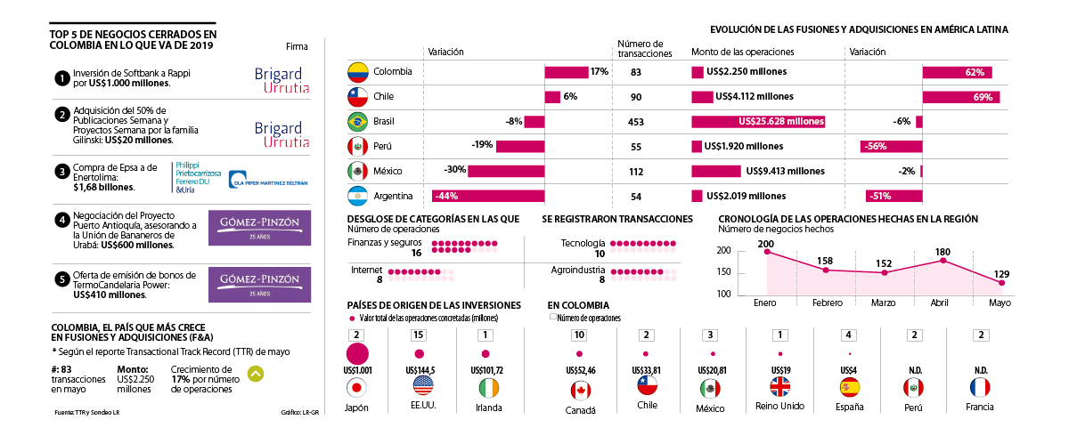 El mercado de fusiones y adquisiciones (F&A) sigue moviendo la caja registradora en 2019. Según el reporte Transactional Track Record (TTR) de mayo, en Colombia se hicieron 83 transacciones, por un valor de US$2.250 millones, evidenciando un crecimiento de 17% por número de operaciones y confirmando que el país es el que más está creciendo en esta materia al compararlo con sus pares en la región.