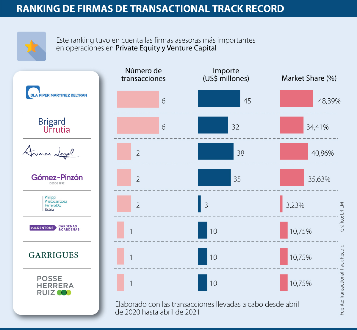 Por número de transacciones, el bufete DLA Piper Martínez Beltrán (6) lideró el listado; Brigard Urrutia (6) y Acumen Legal (2) ocuparon el segundo y tercer puesto, respectivamente. Respecto al capital movilizado por asesoramiento transaccional, el podio varió un poco con DLA Piper Martínez Beltrán (US$45 millones) en primer lugar; Acumen Legal en el segundo puesto, con US$38 millones; y, por último, Gómez Pinzón, con US$35 millones.