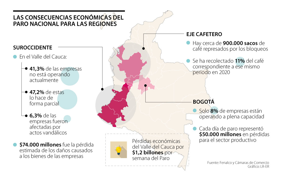 El Valle del Cauca, departamento que ha sido epicentro de disturbios y bloqueos, la Cámara de Comercio de Cali reportó que 41,3% de las compañías no se encuentra operando y 47,2% de ellas lo hace de forma parcial.