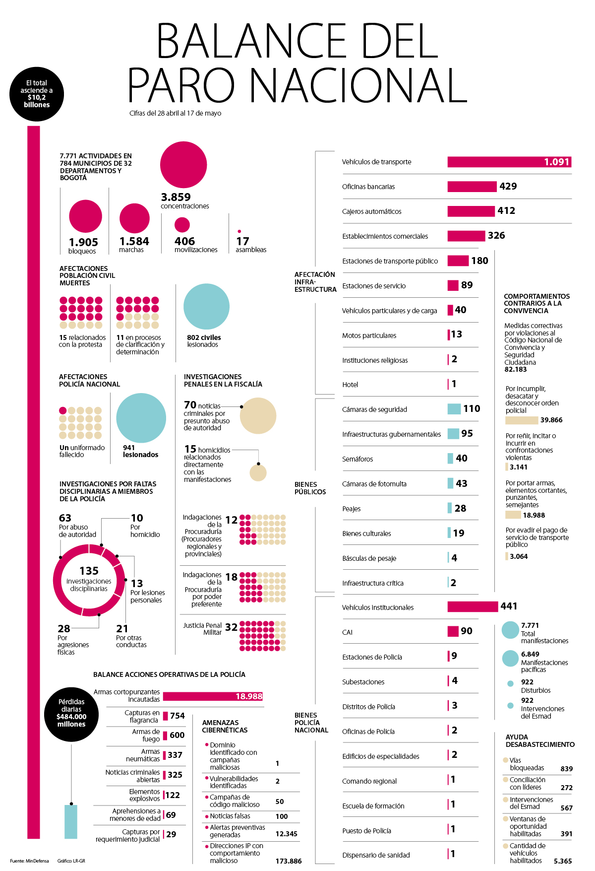 Luego de más de 20 días de que iniciara el Paro Nacional, el Ministerio de Defensa actualizó su balance de afectaciones, en el que se incluye el número de movilizaciones, las personas que han resultado muertas y heridas y los daños a la infraestructura.