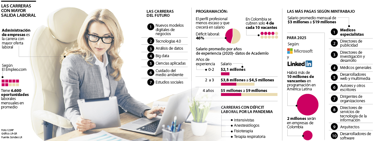 Así también lo ratifica el Ministerio de Educación, que arroja que las carreras más populares en Colombia son administración de empresas, contaduría pública, derecho, ingeniería industrial, psicología e ingeniería de sistemas, entre otras.