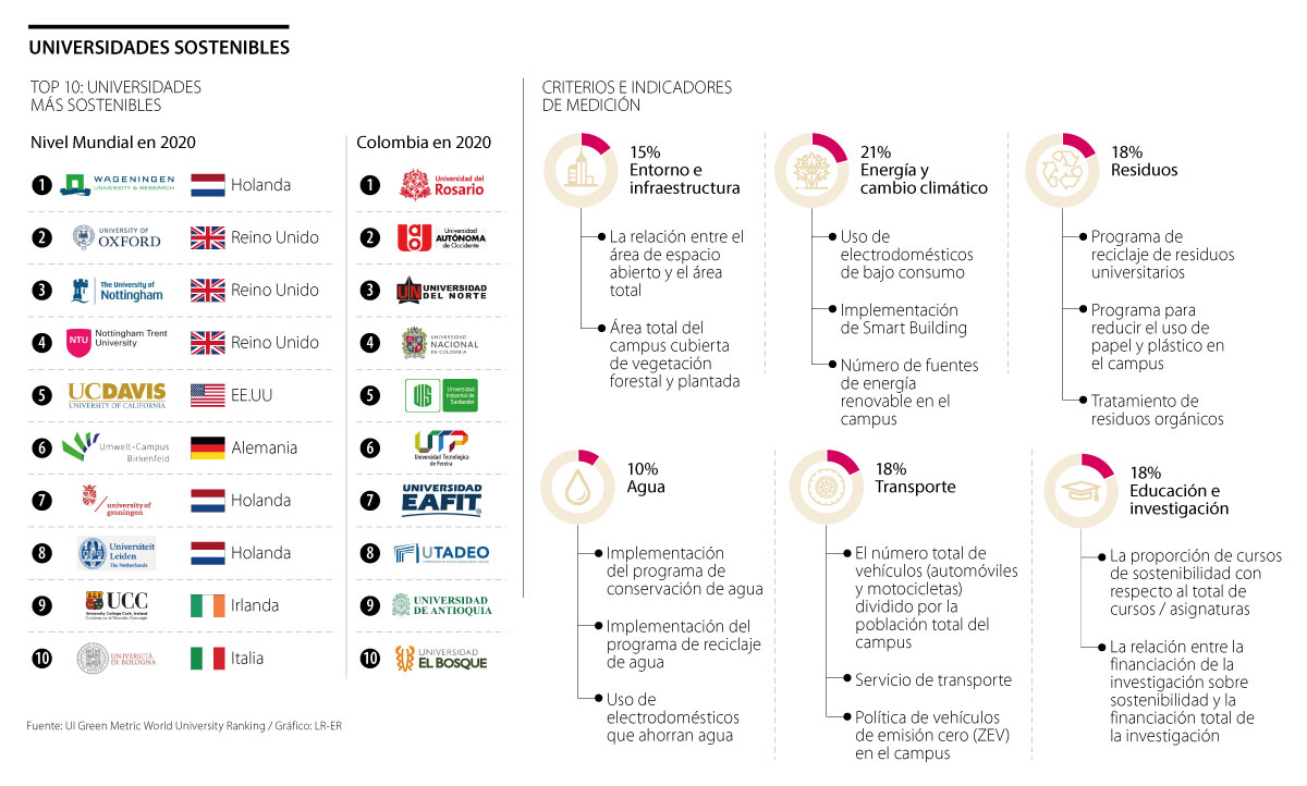 Por otra parte, la firma UI Green Metric publicó su más reciente ranking de las universidades más sostenibles a nivel mundial en la que aparecieron siete instituciones de educación superior de Colombia dentro de las mejores 100.