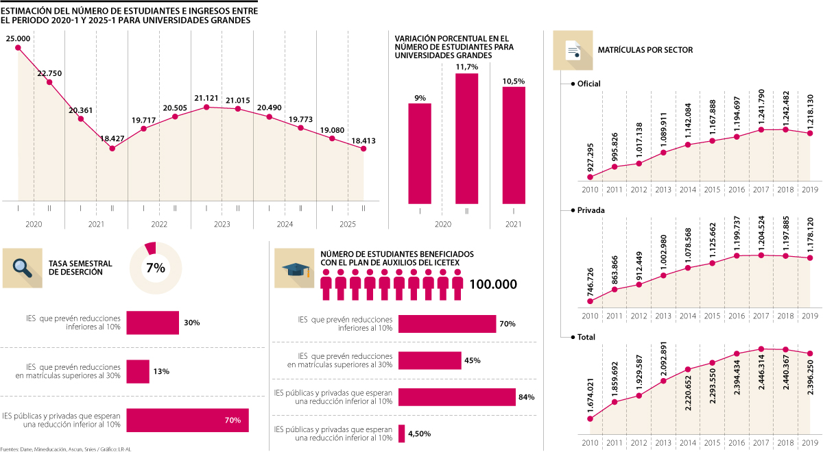 Estimaciones de la Asociación Colombiana de Universidades (Ascun) en 2020, muestran que la variación porcentual en términos de deserción para las universidades más grandes de Colombia podría ser de 10,5% para el primer semestre de 2021. Pese al alto número de dicha proyección, ese indicador bajaría 0,8 puntos porcentuales respecto al semestre inmediatamente anterior (2020-2), dejando un panorama más alentador para el año en curso .