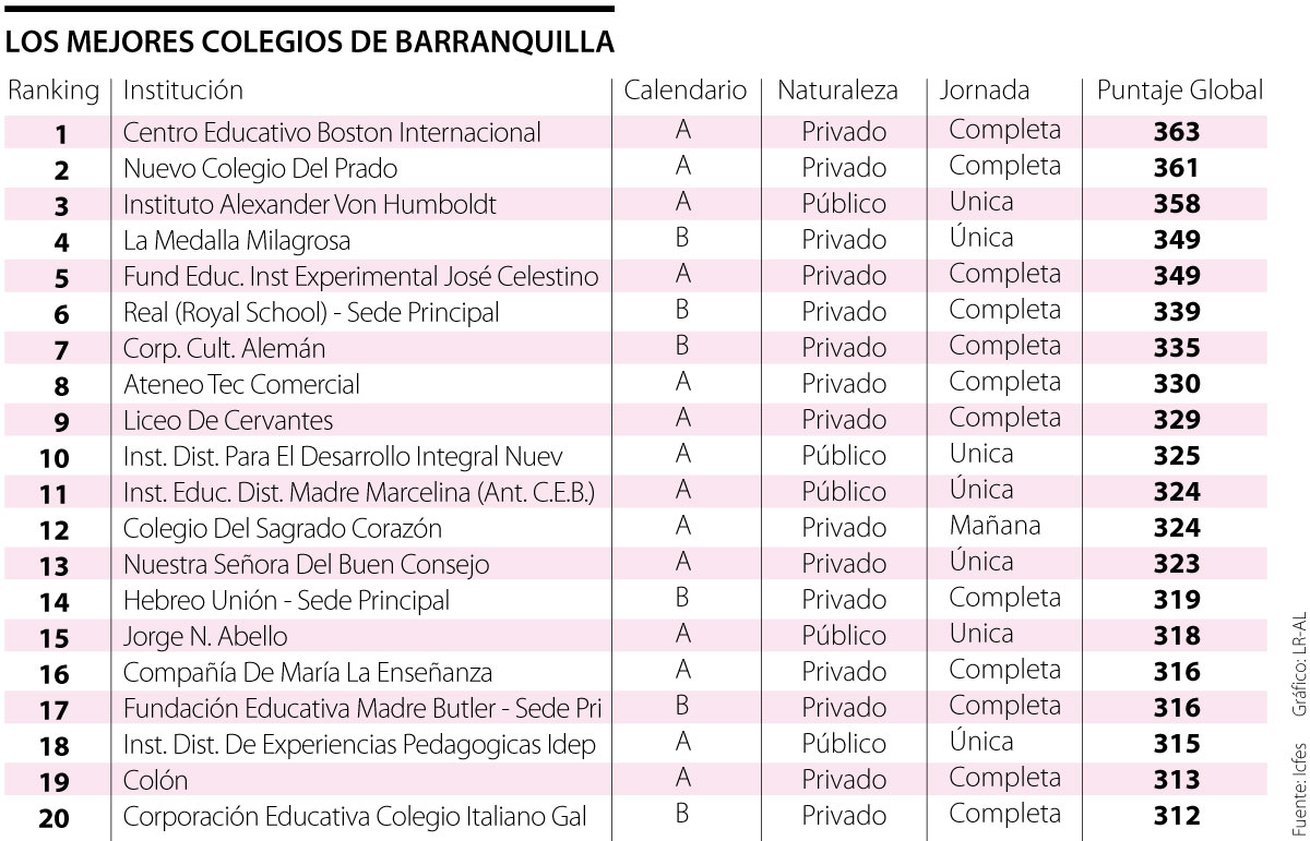 Al revisar el listado, en el segundo lugar de Barranquilla se ubicó el Nuevo Colegio del Prado, calendario A, con puntaje de 361 y el puesto 22 a nivel nacional; luego, en el tercer escaño, con 358 puntos globales, el Instituto Alexander Von Humboldt, de carácter público, en la posición 33 en el país.