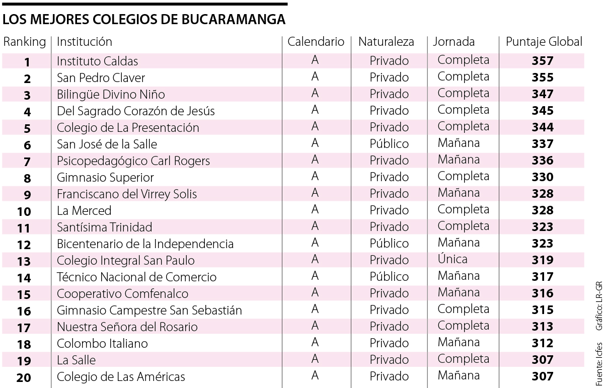 Entre las 20 mejores instituciones mejor posicionadas lidera el Instituto Caldas, con un puntaje global de 357. Este es un plantel privado que cuenta con jornada completa y se ubicó entre los 50 mejores colegios del país.