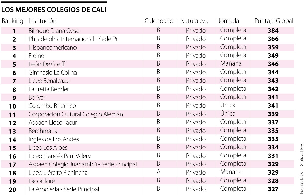 Aunque los 20 primeros colegios del ranking son del sector privado, otras instituciones del sector público lograron puntajes superiores a 250; ese fue el caso del colegio José María Carbonell (303) puntos, el Liceo Departamental (298); la Institución Villacolombia (295); el Comuna Diecisiete (292); el Incolballet (283); Colegio Nuestra Señora de Fátima (283); La Providencia (276) Santa Cecilia (274); el Rafael Navia Varón (273) entre otro, de jornadas única mañana y tarde.