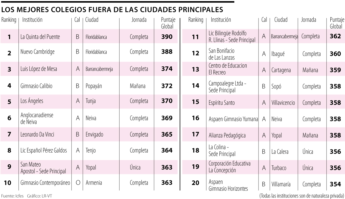 Cuatro colegios de Santander y tres de Cundinamarca están dentro de los 20 mejores del ranking nacional sin ciudades principales
