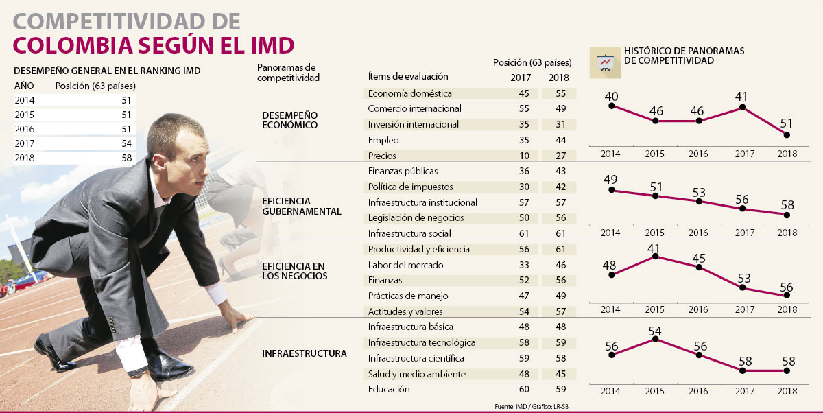 El IMD mide cuatro categorías generales: desempeño económico, eficiencia gubernamental, eficiencia en los negocios e infraestructura. El primero fue el que peor le fue, pues cayó 10 posiciones, especialmente por los deterioros en la variable de precios, empleo y economía doméstica. Según el Centro Privado de Competitividad (CPC), esto se explica porque el crecimiento del PIB per cápita se desaceleró a 0,65% anual en 2017. “Con su economía estancada, no es de extrañarse que Colombia esté en los peores lugares de este ranking, pues ha venido en descenso en los últimos cinco años”, concluyó Mora.