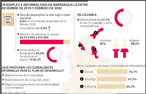 A pesar de que las cifras de desempleo en Barranquilla se han mantenido bajas, siendo por gran parte de 2019 la segunda del país con menor tasa (actualmente de 8,9%), uno de los problemas que asumió el alcalde Jaime Pumarejo al momento de ocupar el cargo fue la informalidad, que según el último reporte del Departamento Administrativo Nacional de Estadística (Dane) alcanzó los 54,9 puntos porcentuales.