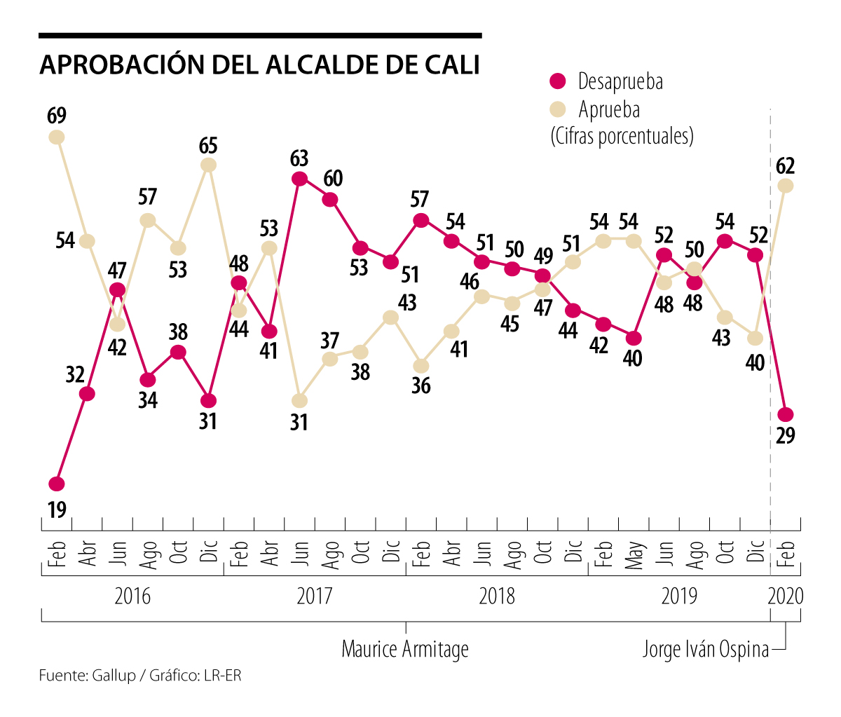 Según el estudio de opinión pública de Gallup, que divulga la firma encuestadora Invamer cada dos meses, el mandatario de la capital del Valle del Cauca inició su mandato con la aprobación de 62% de los habitantes. El reporte, realizado y publicado en febrero de este año con una base de 200 encuestados y un margen de error de 7%, reveló también que 29% de la población desaprueba la gestión de Jorge Iván Ospina.